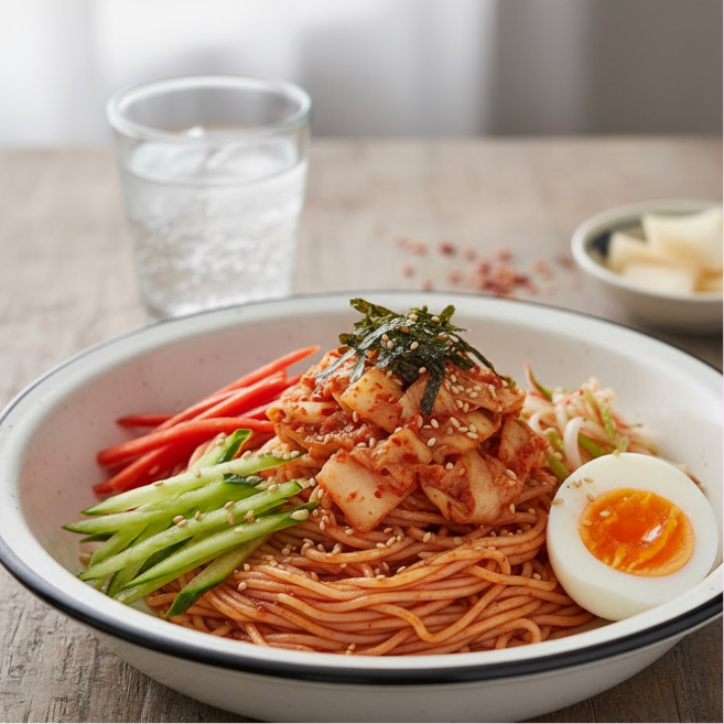 | 6 | 담기 및 비비기 | 그릇에 국수를 담고 김치, 오이를 올린 후 생생정보통 비빔국수 양념장 3-4큰술을 넣어줍니다. 통깨를 솔솔 뿌리고 입맛에 따라 참기름을 넣어 비벼먹으세요! |