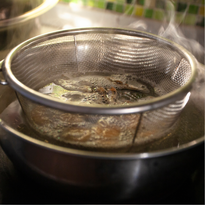 육수가 충분히 우러나면 멸치와 다시마를 건져냅니다. 국자나 체를 사용합니다.