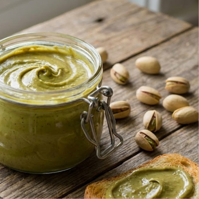 피스타치오 스프레드는 구운 피스타치오를 곱게 갈아 오일과 감미료를 섞어 만든 견과 버터입니다. 은은한 초록빛과 고소하면서도 부드러운 맛이 특징입니다.